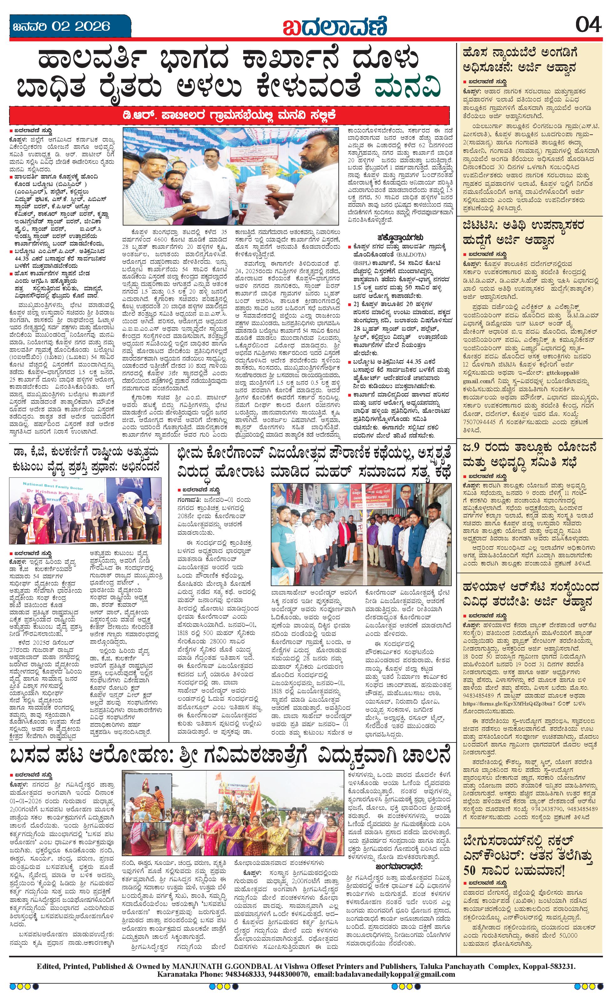 ಬದಲಾವಣೆ 02 JANUARY 2026 Page: 4 January 02, 2026 << First << 4 >> Last >> Page 1Page 2Page 3Page 4 × ಬದಲಾವಣೆ 02 JANUARY 2026 Badalavane Jan-02-Koppal Edition pdf-page-001Badalavane Jan-02-Koppal Edition pdf-page-002Badalavane Jan-02-Koppal Edition pdf-page-003Badalavane Jan-02-Koppal Edition pdf-page-004 << First << 4 >> Last >> Badalavane Jan-02-Koppal Edition pdf-page-001Badalavane Jan-02-Koppal Edition pdf-page-002Badalavane Jan-02-Koppal Edition pdf-page-003Badalavane Jan-02-Koppal Edition pdf-page-004 Badalavane Jan-02-Koppal Edition pdf-page-004