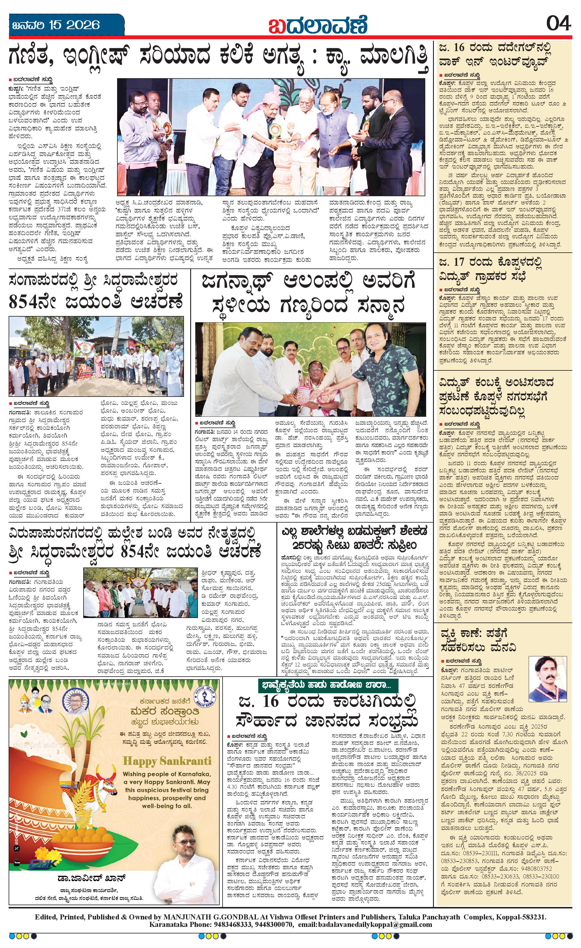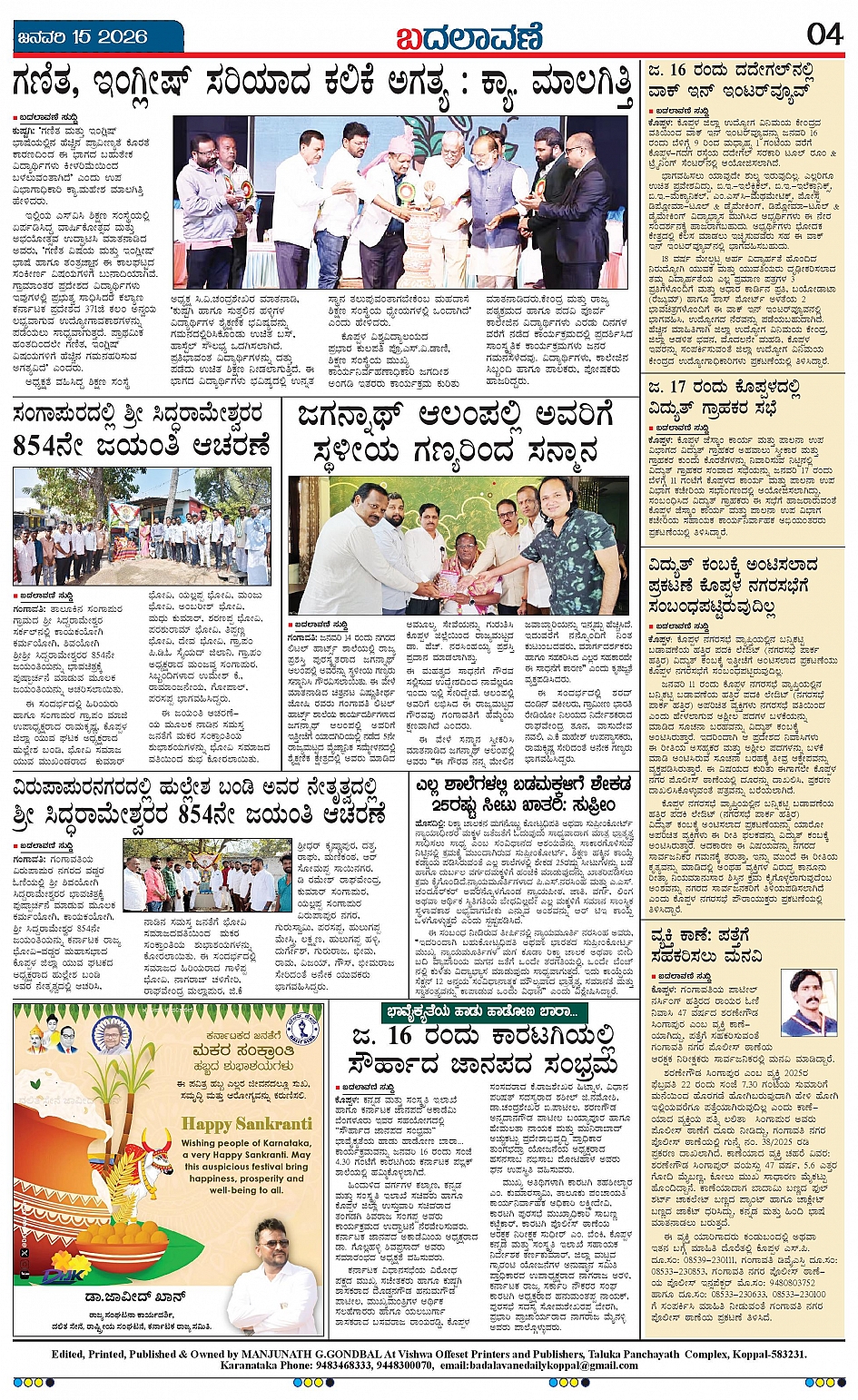 ಬದಲಾವಣೆ 15 JANUARY 2026 Page: 4 January 15, 2026 << First << 4 >> Last >> Page 1Page 2Page 3Page 4 × ಬದಲಾವಣೆ 15 JANUARY 2026 Badalavane Jan-15-Koppal Edition pdf-page-001Badalavane Jan-15-Koppal Edition pdf-page-002Badalavane Jan-15-Koppal Edition pdf-page-003Badalavane Jan-15-Koppal Edition pdf-page-004 << First << 4 >> Last >> Badalavane Jan-15-Koppal Edition pdf-page-001Badalavane Jan-15-Koppal Edition pdf-page-002Badalavane Jan-15-Koppal Edition pdf-page-003Badalavane Jan-15-Koppal Edition pdf-page-004 Badalavane Jan-15-Koppal Edition pdf-page-004