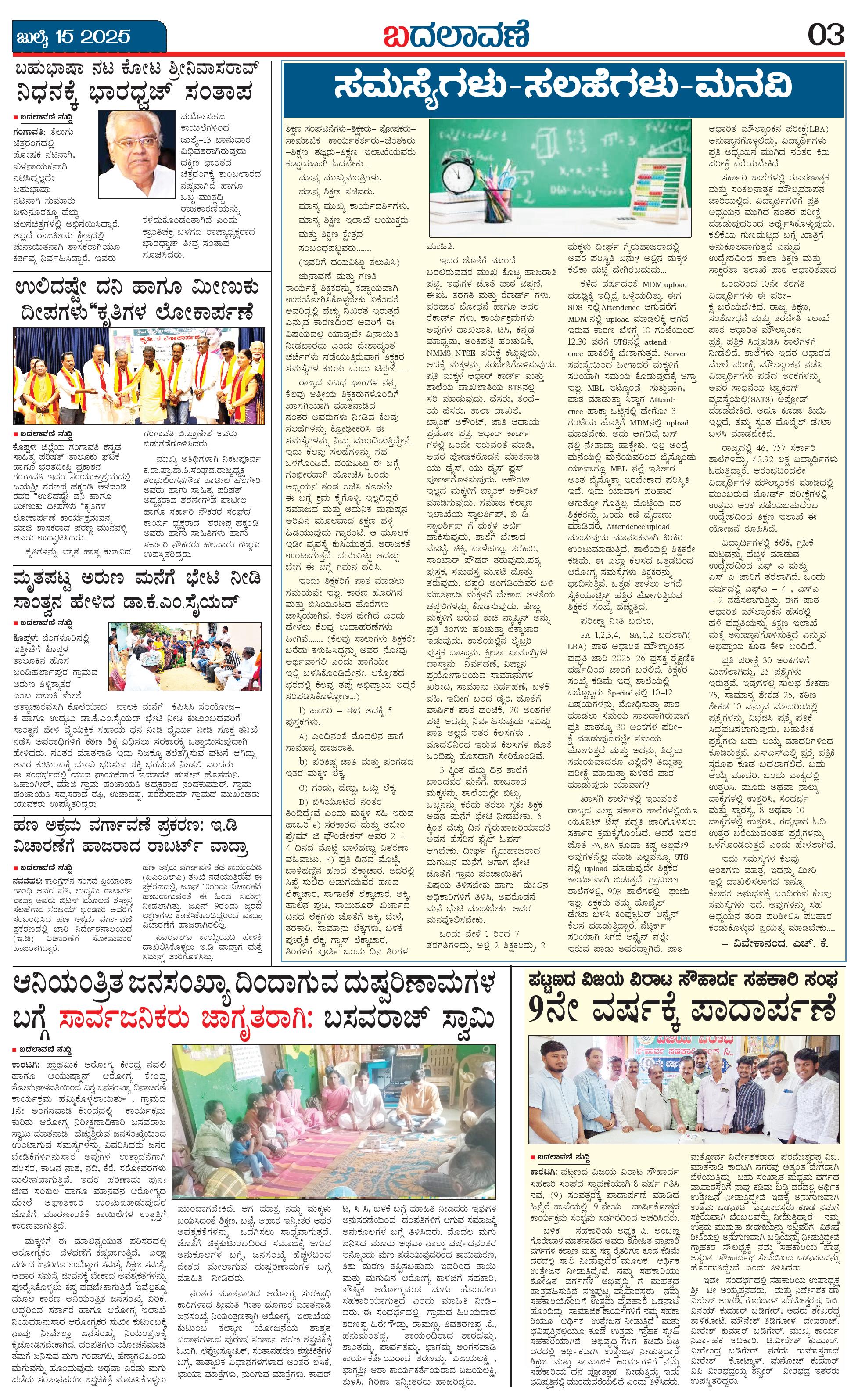 ಬದಲಾವಣೆ 15 JULY 2025 Page: 3 July 15, 2025 << First << 3 >> Last >> Page 1Page 2Page 3Page 4 × ಬದಲಾವಣೆ 15 JULY 2025 page-1page-2page-3page-4 << First << 3 >> Last >> page-1page-2page-3page-4 page-3