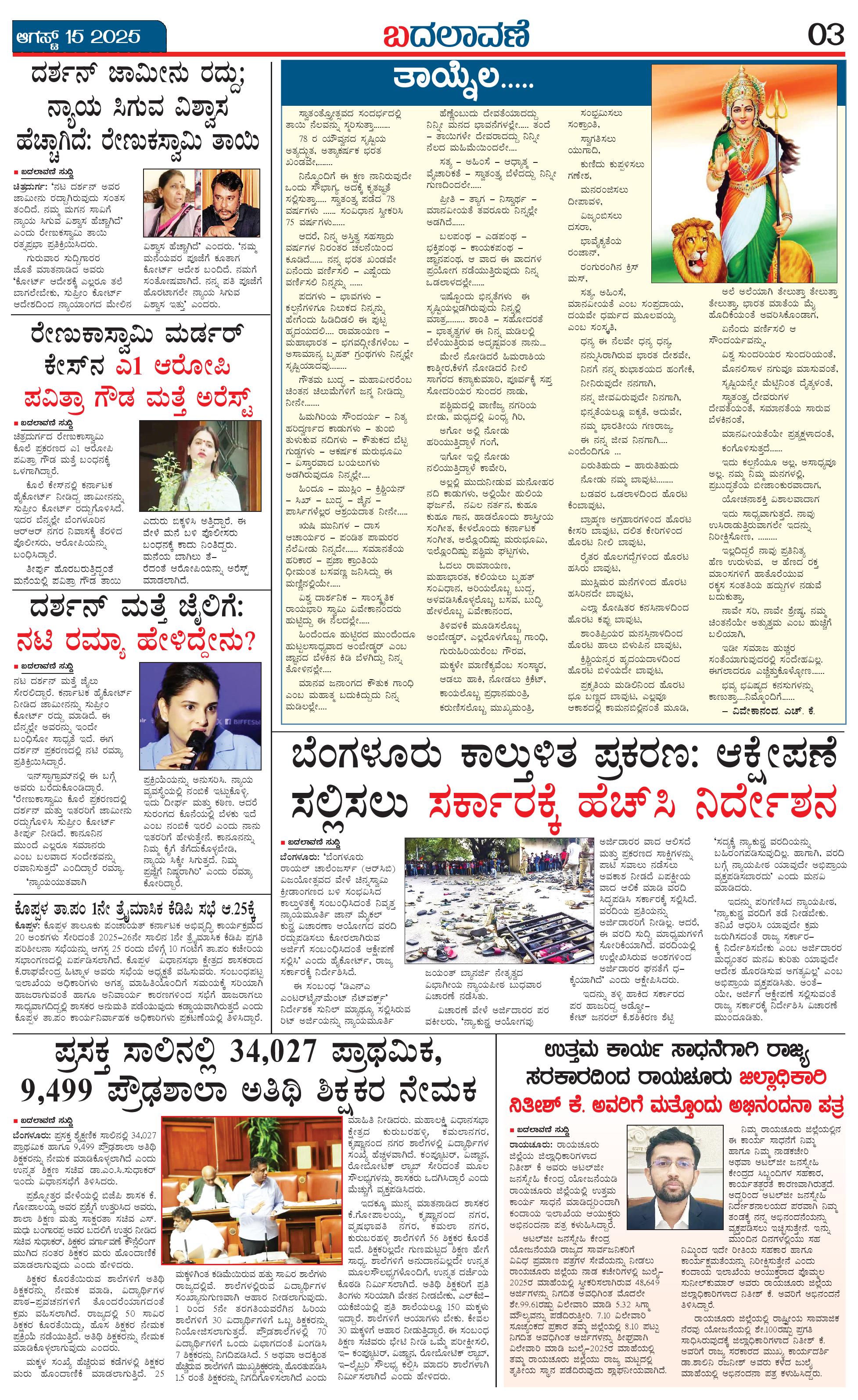 ಬದಲಾವಣೆ 15 AUGUST 2025 Page: 3 August 15, 2025 << First << 3 >> Last >> Page 1Page 2Page 3Page 4 × ಬದಲಾವಣೆ 15 AUGUST 2025 page-1page-2page-3page-4 << First << 3 >> Last >> page-1page-2page-3page-4 page-3